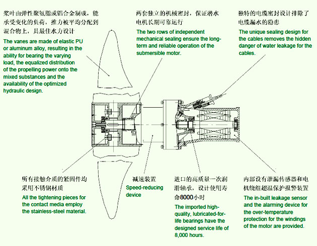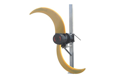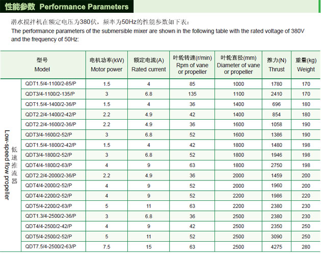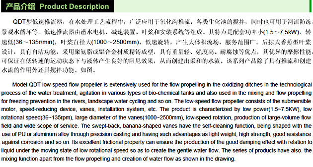 QDT型低速推流器,在水處理工藝流程中,廣泛應(yīng)用于氧化溝推流,各類(lèi)生化池的攪拌,同時(shí)也可用于河流防凍,景觀水循環(huán)等。低速推流器油潛水電機(jī)、減速裝置、葉槳和安裝系統(tǒng)等組成。其特點(diǎn)是配套功率小(1.5-7.5KW),轉(zhuǎn)速低(36-135r/min),葉槳直徑大(1000-2500mm),低速旋轉(zhuǎn),產(chǎn)生大體積流場(chǎng),服務(wù)范圍廣。后掠式香蕉型葉槳設(shè)計(jì),具有自潔功能,采用聚氨脂或鋁合金材質(zhì)精鑄成型,具有重量輕、強(qiáng)度高、耐腐蝕等優(yōu)點(diǎn),其優(yōu)異的摩擦性能,可保證在低速的運(yùn)動(dòng)狀態(tài)下與液體產(chǎn)生良好的阻尼效果,從而創(chuàng)建出柔和的水流。該系列產(chǎn)品除了具有推流和創(chuàng)建水流的作用外還具有攪拌功能。