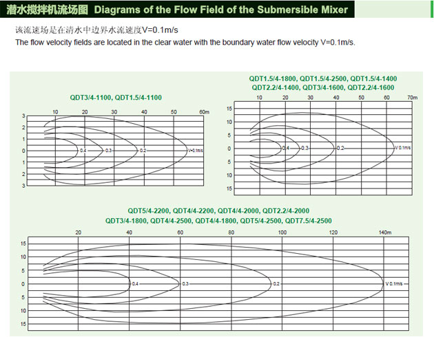 潛水?dāng)嚢铏C(jī)的選型是一項(xiàng)比較復(fù)雜的工作,選型方案的正確與否直接影響到設(shè)備的正常使用,作為選型的原則就是要讓攪拌機(jī)在適合的容積里發(fā)揮充分的攪拌功能,這個(gè)標(biāo)準(zhǔn)一般可用流速來(lái)確定。根據(jù)污水處理廠的不同工藝要求,攪拌機(jī)選型的佳流速應(yīng)保證在0.15~0.3m/s之間,如果低于0.15m/s的流速則達(dá)不到推流攪拌的效果,如果超過(guò)0.3m/s的流速則會(huì)影響工藝效果且造成浪費(fèi)。所以在選型前,首先要確定潛水?dāng)嚢铏C(jī)運(yùn)用在什么場(chǎng)所,如:污水池、污泥池還是生化池;其次是介質(zhì)參數(shù),如:懸浮物含量、溫度、PH值等;還有水池的形狀,水深甚至安裝方式等都將對(duì)選型產(chǎn)生影響,同時(shí)還應(yīng)考慮到節(jié)能因素,因?yàn)檫@將會(huì)影響到用戶(hù)今后的運(yùn)行成本。可參考下面的潛水?dāng)嚢铏C(jī)流場(chǎng)圖。
