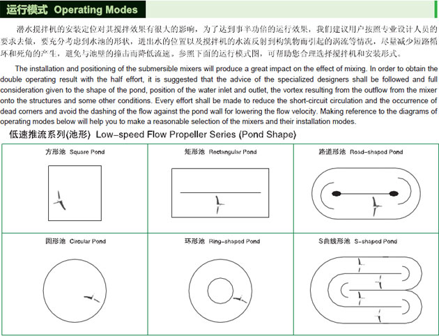 潛水?dāng)嚢铏C(jī)的安裝定位對(duì)其攪拌效果有很大的影響,為了達(dá)到事半功倍的運(yùn)行效果,我們建議用戶(hù)按照專(zhuān)業(yè)設(shè)計(jì)人員的要求去做,要充分考慮到水池的形狀,進(jìn)出水的位置以及攪拌機(jī)的水流反射到構(gòu)筑物向引起的渦流等情況,盡量減少短路循環(huán)和死角的產(chǎn)生,避免與池壁的撞擊而降低流速。參照下面的運(yùn)行模式圖,可幫助您合理選擇攪拌機(jī)和安裝形式。