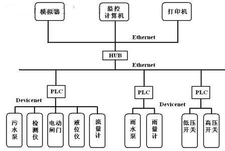 監(jiān)控計(jì)算機(jī)、污水泵房控制PLC、雨水泵房控制PLC、變電所自動(dòng)化系統(tǒng)的數(shù)據(jù)集總器等設(shè)備采用工業(yè)以太網(wǎng)(Ethernet)相互連接。PLC與水泵、閘門等機(jī)械設(shè)備的控制箱之間采用DeviceNet總線相互連接。儀表的模擬量和脈沖量信號(hào)則通過(guò)遠(yuǎn)端I/O模塊轉(zhuǎn)接入DeviceNet。