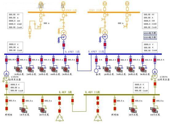 信息層位于中央控制室,利用易控(INSPEC)組態(tài)軟件設(shè)計(jì)完成整個(gè)監(jiān)控系統(tǒng)的圖形界面,以及監(jiān)控?cái)?shù)據(jù)報(bào)表等?蓪(duì)全泵站生產(chǎn)數(shù)據(jù)進(jìn)行收集以及集中控制,設(shè)有上位機(jī)2臺(tái)(工程師站、操作員站各一臺(tái))以及相關(guān)打印機(jī)與不間斷電源UPS,上位機(jī)通過(guò)以太網(wǎng)與PLC分站連接;設(shè)有模擬屏,顯示全泵站的電力監(jiān)控情況。