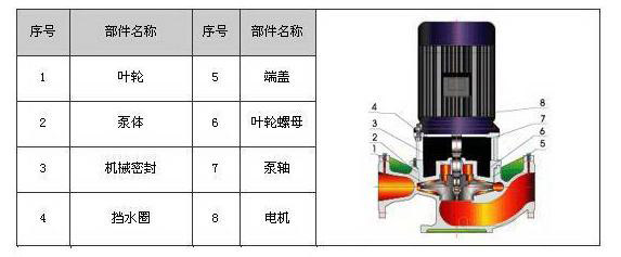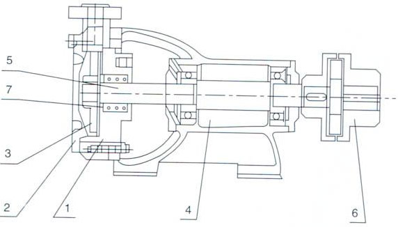 主要零件(見結(jié)構(gòu)圖)有(1)泵(2)泵蓋(3)葉輪(4)托架結(jié)合體(5)泵軸(6)爪型彈性聯(lián)軸器(7)特別組合體機(jī)械密封。該型泵與電機(jī)合裝在同一底座上.進(jìn)、出口方向?yàn)樾辫上.經(jīng)接彎管可変為垂直向上。葉輪在軸上能夠自由地作軸向移動,泵在工作中葉輪能自行調(diào)節(jié)好與泵體和泵蓋之間的間隙。