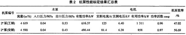 有效功率是水泵傳給水的凈功率。也就是水泵在單位時間內,給多少重量的水提升了多少高度。水泵效率是有效功率與軸功率之比。效率愈高。表示水泵本身損失的功率愈少。從表2數(shù)據(jù)中可以看出,2泵在開工頻冷水泵時出口壓力0.53MPa、水泵有效功率616.37kW。電機有用功率1311kW、功率因數(shù)cos<P0.96、機泵效率47.02%。在變頻狀態(tài)下冷水泵出口壓力調至供水壓力下限0.43MPa、水泵有效功率486.44kW、電機有用功率858kW、功率因數(shù)cosq)0.97、機泵效率56.69%。數(shù)據(jù)說明變頻狀態(tài)下變頻泵在出El壓力降低時。電機的有用功率有所下降,水泵的有效功率也隨之下降。但電機電流降低了約40%,同時功率因數(shù)和機泵效率卻有所上升,表明在滿足供水壓力、流量的前提下。使用變頻泵和工頻泵并聯(lián)運行,可比兩臺工頻泵并聯(lián)運行節(jié)能。見表3。