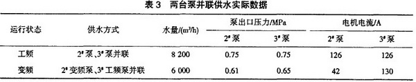 從表3兩臺泵并聯(lián)供水實際數(shù)據(jù)中可以清楚看到在工頻狀態(tài)下。泵出El壓力都超出了正常運行壓力,已致引起機泵振動和發(fā)熱。而在 泵變頻狀態(tài)下與3#工頻泵并聯(lián)運行時,泵出El壓力有所降低。2變頻泵電機電流則大幅下降。因此可以得出以下結論: