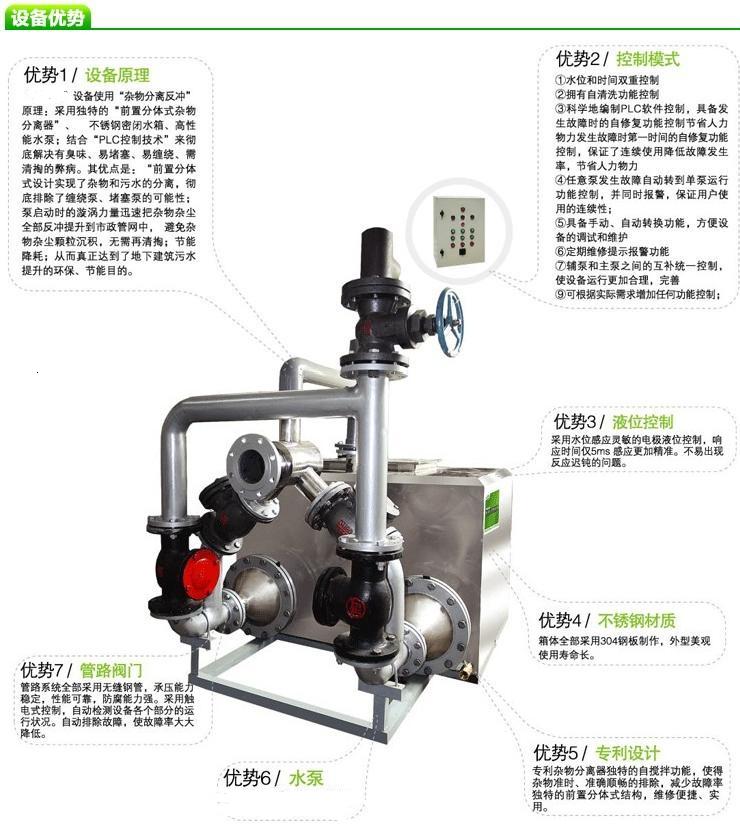 全自動(dòng)地下污水提升器(提升設(shè)備)是一款適用于餐飲業(yè)、娛樂行業(yè)、休閑服務(wù)業(yè)、建筑工程、商業(yè)工程、化工廠、生產(chǎn)加工廠、制藥廠、醫(yī)用、市政工程等地下污水排放系統(tǒng)的全自動(dòng)地下污水提升器。污水處理一直都是令人頭疼的問題,傳統(tǒng)的做法都是在地下挖集水井(污水坑),在集水井中放置污水泵,也就是俗稱的“一坑兩泵”,一坑兩泵的污水處理的方式存在異味、污水泵易堵塞、污水坑清掏難、污染周圍環(huán)境等弊病。金利潔牌PW系列全自動(dòng)污水提升器采用雙泵雙分離器,雙泵雙分離器交替工作,互為備用,任意泵發(fā)生故障都可以在PLC控制系統(tǒng)下自動(dòng)轉(zhuǎn)到單泵運(yùn)行控制,滿足地下污水持續(xù)提升排放的需要。雜物分離專利技術(shù)更是解決了易堵塞、清掏難的問題,污物被濾網(wǎng)濾出,暫存機(jī)體,后隨水流壓力自行排出,實(shí)現(xiàn)真正的免清掏,污物并不接觸水泵葉輪,不會(huì)因污物纏繞造成堵塞,整個(gè)污水處理過程都是在密閉性良好的不銹鋼箱體中進(jìn)行,不會(huì)出現(xiàn)污水和異味外泄的情況。傳統(tǒng)的利用兩個(gè)液位控制水泵的啟停很容易出現(xiàn)低液位不識(shí)別的問題,使水泵失去控制,而全自動(dòng)地下污水提升器采用PLC控制系統(tǒng)結(jié)合高液位一個(gè)高液位的獨(dú)有技術(shù),很好的解決了低液位不識(shí)別問題,響應(yīng)時(shí)間僅為5ms,感應(yīng)更靈敏,反應(yīng)更快。