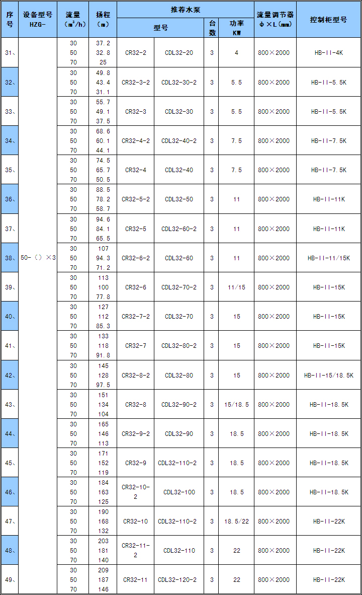 2) 設(shè)備的流量不包括備用泵流量,表中的水泵均有一臺備用泵。