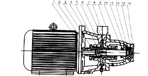 泵體4與電機(jī)法蘭連接,泵軸8裝在電機(jī)軸頭上是動配合,鍵2在鍵槽內(nèi)可自由滑動。