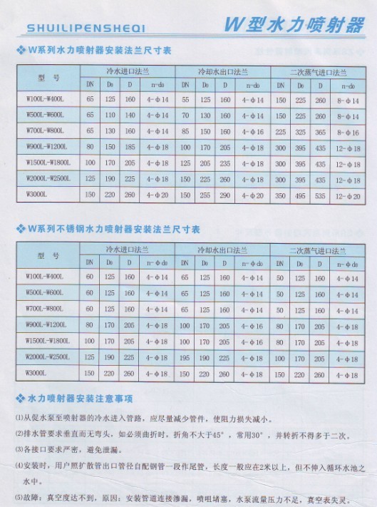 W-系列水力噴射器是一種具有抽真空、冷凝、排水等三種有效功能的機械裝置。它是利用一定壓力的水流通過對稱均布成一定傾斜度的噴咀噴出。聚合在一個焦點上,由于噴射水流速度較高,于是周圍形成負壓使器室內(nèi)產(chǎn)生真空,另外由于二次蒸汽與噴射水流直接接觸,進行熱交換,絕大部分的蒸汽凝結(jié)成水,小量未被冷凝的蒸汽與不凝結(jié)的氣體亦由于與高速噴射的水流相互摩擦,混合與擠壓,通過擴壓管被排除,使室內(nèi)形成更高的真空。