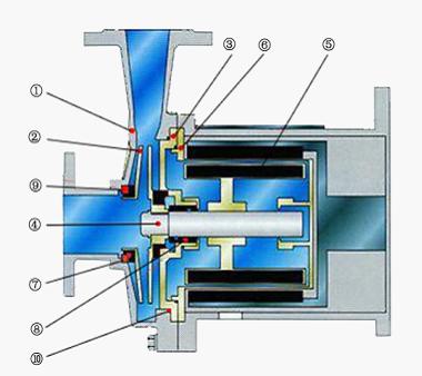 6、磁力泵運(yùn)行500小時(shí)后,應(yīng)拆檢軸承和端面動(dòng)環(huán)的磨損惰況,若軸承和軸套的間隙大于0.5~1mm,葉輪軸向竄動(dòng)1.5~2mm時(shí),應(yīng)更換軸承和軸向動(dòng)環(huán)。