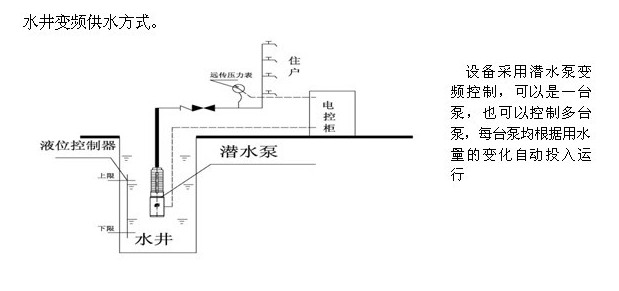 變頻恒壓供水設(shè)備是一種新型的節(jié)能供水設(shè)備。變頻恒壓供水設(shè)備系運(yùn)用當(dāng)今先進(jìn)的微電腦控制技術(shù),將變頻調(diào)速器與電機(jī)水泵組合而成的機(jī)電一體化高科技節(jié)能供水裝置。變頻恒壓供水設(shè)備以水泵出水端水壓(或用戶(hù)用水流量)為設(shè)定參數(shù),通過(guò)微機(jī)自動(dòng)控制變頻器的輸出頻率從而調(diào)節(jié)水泵電機(jī)的轉(zhuǎn)速,實(shí)現(xiàn)用戶(hù)管網(wǎng)水壓的閉環(huán)調(diào)節(jié),使供水系統(tǒng)自動(dòng)恒穩(wěn)于設(shè)定的壓力值:即用水量增加時(shí),頻率提高,水泵轉(zhuǎn)速加快;用水量減少時(shí),頻率降低,水泵轉(zhuǎn)速減慢。這樣就保證了整個(gè)用戶(hù)管網(wǎng)隨時(shí)都有充足的水壓(與用戶(hù)設(shè)定的壓力一致)和水量(隨用戶(hù)的用水情況變化而變化)。