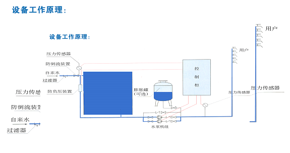 3.運行可靠性:當(dāng)用水高峰時,或自來水停水時,由水箱供水,大大提高用戶用水的可靠性,完全符合自水供水規(guī)范。