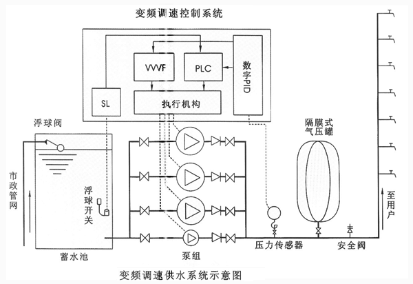 系統(tǒng)正常運(yùn)行時(shí),用戶用水管網(wǎng)上的壓力傳感器對(duì)用戶的用水水壓進(jìn)行數(shù)據(jù)采樣,并將壓力信號(hào)轉(zhuǎn)換為電信號(hào),傳輸至PID調(diào)節(jié)器,然后與用戶設(shè)定的壓力值進(jìn)行比較和運(yùn)算,并將比較和運(yùn)算的結(jié)構(gòu)轉(zhuǎn)換為頻率調(diào)節(jié)信號(hào)和水泵啟動(dòng)臺(tái)數(shù)信號(hào)分別送至變頻器和可編程控制器(PLC);變頻器數(shù)據(jù)以調(diào)節(jié)水泵電機(jī)的電源頻率,進(jìn)而調(diào)整水泵的轉(zhuǎn)速;可編程控制器根據(jù)PID調(diào)節(jié)器傳輸過(guò)來(lái)的水泵啟動(dòng)臺(tái)數(shù)信號(hào)控制水泵的動(dòng)轉(zhuǎn)。通過(guò)對(duì)水泵的啟動(dòng)和停止臺(tái)數(shù)及其中變頻泵轉(zhuǎn)速的調(diào)節(jié),將用戶管網(wǎng)中的水壓恒穩(wěn)于用戶預(yù)先設(shè)定的壓力值,使供水泵組“提升”的水量與用戶管網(wǎng)不斷變化的用水量保持一致,達(dá)到“變量恒壓供水”的目的。