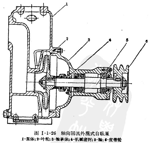 該圖為軸向回流式結(jié)構(gòu),相當(dāng)于單蝸殼離心泵加一儲(chǔ)水室,儲(chǔ)水室有回流孔與蝸殼相通,水從軸向回流入葉輪外緣及外部。