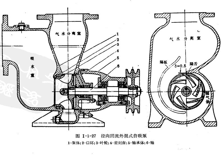 該圖為徑向回流式結(jié)構(gòu),蝸殼是雙層的,相當(dāng)于過水?dāng)嗝孑^大的單蝸殼壓水室內(nèi)加一塊曲率與其相似的隔板,把它分為內(nèi)外兩個(gè)蝸形流到,泵體上不過水?dāng)嗝孀兇,為氣水分離室,水從徑向回流入葉輪外緣及外部。