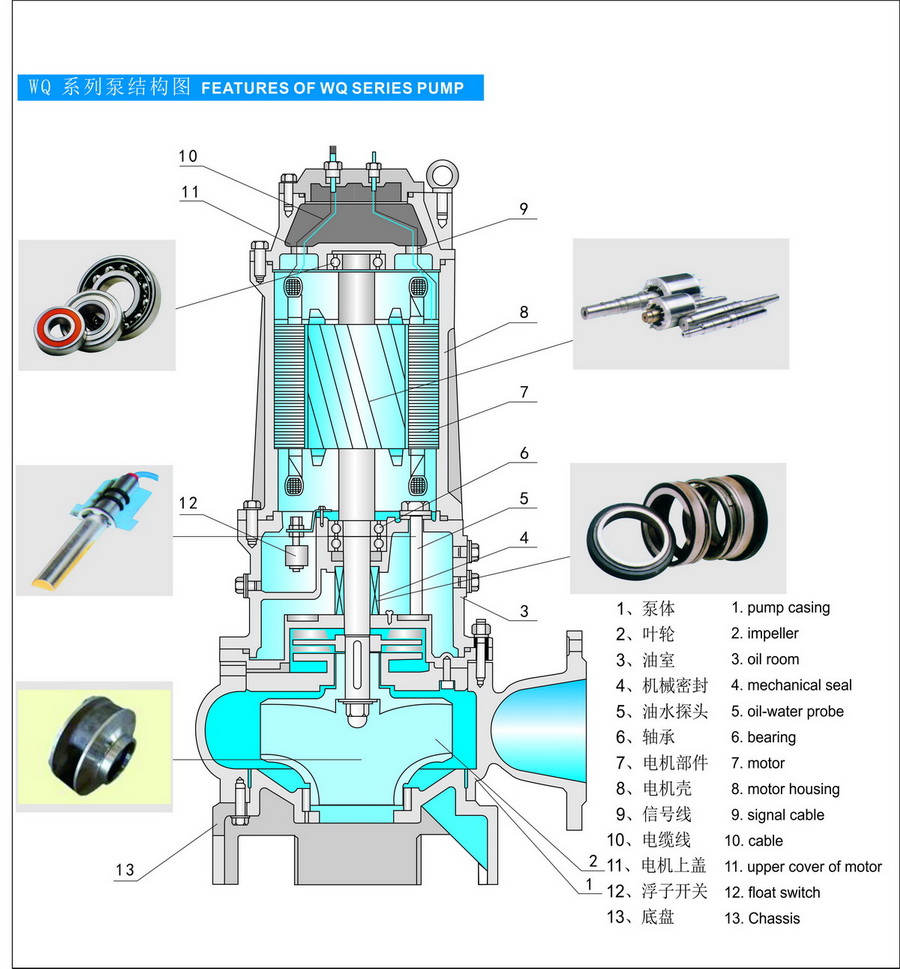WQP型不銹鋼排污泵由電機(jī)與泵兩部分組成,二者通過(guò)油隔離室及機(jī)械密封組件隔幵,屬機(jī)電一體化產(chǎn)品, 電機(jī)與泵合用同一軸(轉(zhuǎn)子)整個(gè)水泵長(zhǎng)度短,結(jié)構(gòu)緊湊。配備多種保護(hù)裝置,使得泵運(yùn)行安全可靠。其主要部件作用如下: