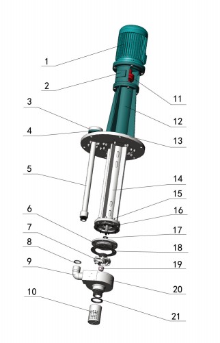 15)泵體螺栓 16)包塑主軸 17)葉輪墊床 18)泵蓋墊床 19)葉輪端部組合件 20)泵體 21)濾罩墊床