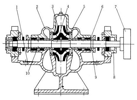 1—泵體;2—泵蓋;3—葉輪;4—軸;5—密封環(huán);6—軸套;7—聯(lián)軸器;8—軸承體;9—填料壓蓋;10—填料