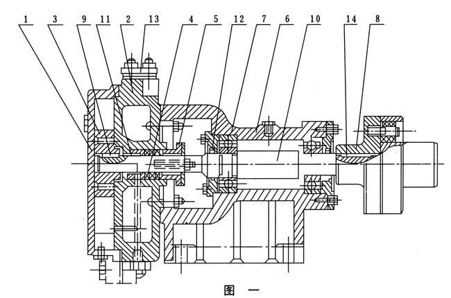 由鑄鐵制成葉輪(3),有l(wèi)2個(gè)葉片呈放射狀均分布,有平衡孔(其中兩個(gè)套扣供拆卸用)平軸向力。口十輪平鍵(9)與軸(10)聯(lián)接并可沿軸向滑動(dòng)調(diào)節(jié)間隙。軸為優(yōu)質(zhì)鋼制成,支承在泵的托架(6)內(nèi)的兩個(gè)滾珠軸承(17)上右端有彈性聯(lián)軸器(8)和電機(jī)直接聯(lián)接。托架(6)用鑄鐵制成,有止口保證與泵體準(zhǔn)確聯(lián)接,軸承間有空腔,可存潤(rùn)滑油,用稀油或黃油滑均可。
