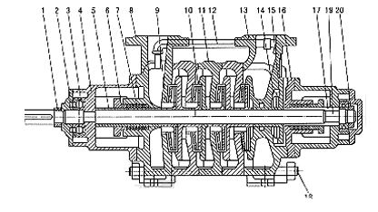2.GC型多級離心泵的主要零件有軸、軸套、進水段、葉輪、導翼、密封環(huán)、中段、出水段、平衡環(huán)、,衡盤、尾蓋進水段、中段、出水段蓋均為鑄鐵制成,共同形成泵的工作室。
