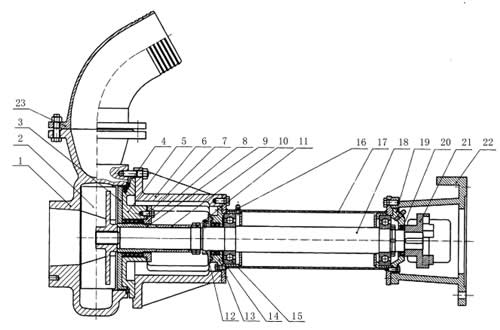 1、泵體 2、葉輪 3、泵蓋護板4、泵體膠墊 5、泵蓋 6、泵座7、油封 8、油封壓蓋 9、軸套 10、定位套 11、調整螺母 12、封塵端蓋 13、泵聯(lián)器 14、油封 15、軸承(6313) 16、注油杯 17、中段 18、軸 19、上軸承壓蓋 20、油封 21、泵聯(lián)器 22、電機支架 23、出水彎管