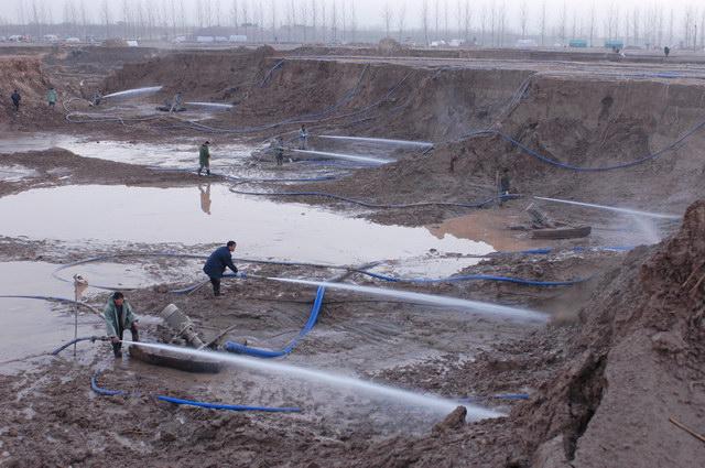 水利挖沙、挖土、沖填機組進行水利機械化施工,是模擬自然界水流沖刷得原理,借水力的作用來進行挖沙、挖土工作,水經(jīng)高壓泵產(chǎn)生壓力,通過水槍的噴射,射出高壓高速水柱,水柱沖擊土沙,使土沙濕化、崩解、拌合成泥漿和泥塊的混合物,再由立式泥漿泵提升,通過管道輸送到沙場。