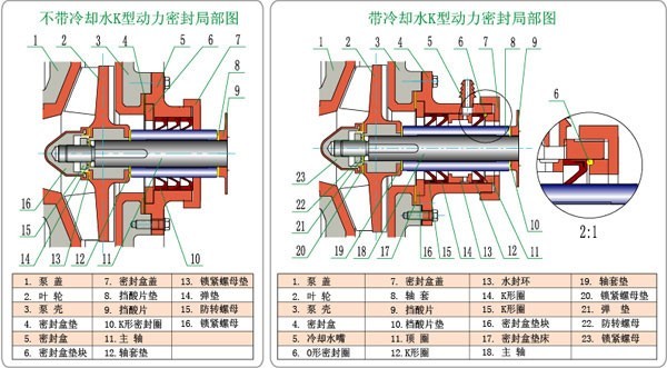 該密封主要由副葉輪(或副葉片)與停車密封(橡膠油封)組成。工作時由于副葉輪(或副葉片)旋轉(zhuǎn)產(chǎn)生的離心力使密封腔處于負(fù)壓狀態(tài),從而阻止液體向外泄漏,此時,停車密封不起作用。橡膠油封的唇口因負(fù)壓而松開,與軸套產(chǎn)生一定間隙,減小其之間的磨損,延長了使用壽命;停機時,由于副葉輪(或副葉片)停止旋轉(zhuǎn),密封腔由負(fù)壓轉(zhuǎn)為正壓,停車密封開始工作,橡膠油封的唇口在壓力作用下緊緊包住軸套,從而達到密封目的。若允許冷卻水滲入介質(zhì)內(nèi),可選用帶冷卻水K型動力密封,即可添加外冷卻水裝置,延長油封的使用壽命。該密封的油封采用氟橡膠制成,主要適用于輸送含固體顆粒的料漿、含雜質(zhì)的污水等腐蝕性介質(zhì)(帶冷卻水K型動力密封用的冷卻水為潔凈的自來水,壓力適宜在0.05Mpa以內(nèi))。