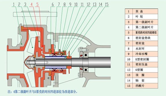 UHB-ZK-AB型耐腐耐磨泵是對UHB-ZK-A系列泵的改進型泵(見上圖)。兩者之間的區(qū)別在于后者是無臺階式背葉片,前者為臺階式背葉片結(jié)構(gòu)(見圖中序號4)。改進后的葉輪的背葉分為二級,二級背葉片之間有凸起臺階。與之相匹配的泵也有凹進的臺階。設(shè)置背葉輪臺階的目的是阻斷泵出口流體壓力對軸密封的返流壓力,保證和延長軸密封的使用壽命。