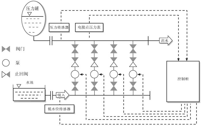 當(dāng)管網(wǎng)壓力大于啟動(dòng)壓力時(shí)設(shè)定值時(shí)由與出水管路連接的壓力罐供水,如果管網(wǎng)壓力等于啟動(dòng)壓力設(shè)定值時(shí)啟動(dòng)水泵,水泵運(yùn)行中管網(wǎng)壓力達(dá)到停止壓力時(shí)停止水泵運(yùn)行,水泵啟動(dòng)后管網(wǎng)壓力超過(guò)啟動(dòng)壓力,未達(dá)到停止壓力時(shí)水泵繼續(xù)運(yùn)行;水泵全速運(yùn)行后管網(wǎng)壓力未達(dá)到啟動(dòng)壓力時(shí)水泵追加啟動(dòng)。