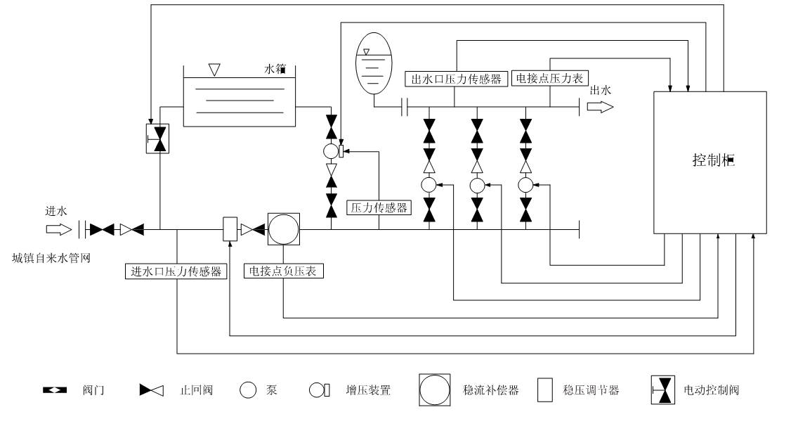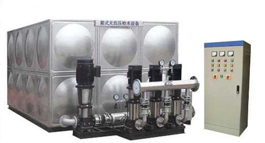 箱式管網(wǎng)疊壓供水設(shè)備(無負(fù)壓增壓水箱)是由水箱,防倒流裝置(根據(jù)需要設(shè)置),防負(fù)壓裝置,水泵機(jī)組,限壓保護(hù)裝置,膨脹罐(根據(jù)需要設(shè)置),控制儀表,控制柜,閥門,管路系統(tǒng),配套附件等組成,從供水管網(wǎng)直接吸水,通過壓力傳感器檢測(cè)出壓力,將檢測(cè)值和設(shè)定值進(jìn)行比較,計(jì)算出在市政自來水管網(wǎng)的原有壓力的基礎(chǔ)上需要增加的壓力值,確定水泵投入臺(tái)數(shù)和變頻器輸出頻率,調(diào)整水泵的轉(zhuǎn)速以符合用水曲線實(shí)現(xiàn)恒壓供水或變壓供水。水箱式管網(wǎng)疊壓供水設(shè)備(自動(dòng)增壓水箱)大程度利用了市政管網(wǎng)自來水的原水壓力,對(duì)市政管網(wǎng)不產(chǎn)生負(fù)壓,系統(tǒng)會(huì)定時(shí)定量或在管網(wǎng)供水量不足時(shí)自動(dòng)切換到水箱內(nèi)吸水,設(shè)備選用不銹鋼水箱和管件,減少了用水的二次污染,是新一代供水領(lǐng)域的節(jié)能產(chǎn)品。