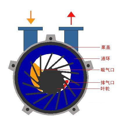如圖:在泵體中裝有適量的水作為工作液。當(dāng)葉輪按圖中順時針方向旋轉(zhuǎn)時,水被葉輪拋向四周,由于離心力的作用,水形成了一個決定于泵腔形狀的近似于等厚度的封閉圓環(huán)。水環(huán)的下部分內(nèi)表面恰好與葉輪輪轂相切,水環(huán)的上部內(nèi)表面剛好與葉片頂端接觸(實際上葉片在水環(huán)內(nèi)有一定的插入深度)。此時葉輪輪轂與水環(huán)內(nèi)界面之間形成一個月牙形空間,而這一空間又被葉輪葉片分成和葉片數(shù)目相等的若干個小腔。如果以葉輪的下部0°為起點,那么葉輪在旋轉(zhuǎn)前180°時小腔的容積由小變大,且與端面上的吸氣口相通,此時氣體被吸入,當(dāng)吸氣終了時小腔則與吸氣口隔絕;當(dāng)葉輪繼續(xù)旋轉(zhuǎn)時,小腔由大變小,使氣體被壓縮;當(dāng)小腔與排氣口相通時,氣體便被排出泵外。