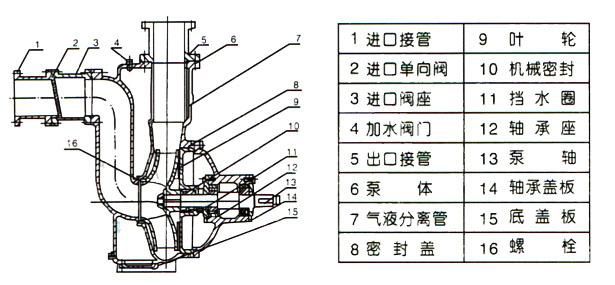 ZW系列自吸無堵塞排污泵,主要由泵體、葉輪、后蓋、機(jī)械密封、泵軸、軸承座、進(jìn)口閥、氣液分離管、加水閥門、進(jìn)、排接管等組成。泵的結(jié)構(gòu)見下圖。