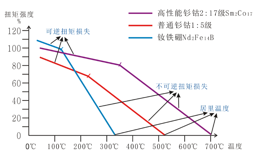 當(dāng)溫度超過(guò)150℃,釹鐵硼材質(zhì)的磁鋼將會(huì)進(jìn)入不可逆扭轉(zhuǎn)損失。當(dāng)溫度超過(guò)250℃,普通釤鈷材質(zhì)的磁鋼將會(huì)進(jìn)入不可逆扭轉(zhuǎn)損失。