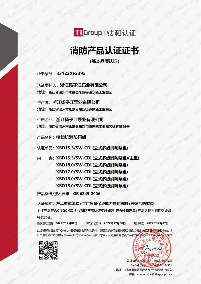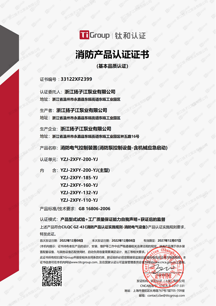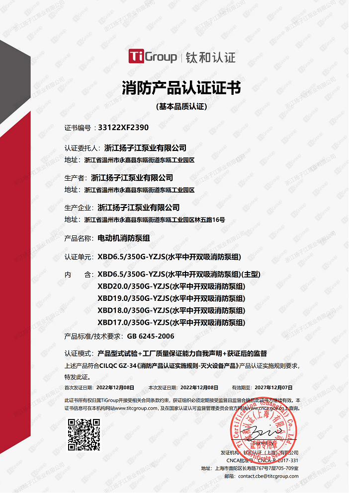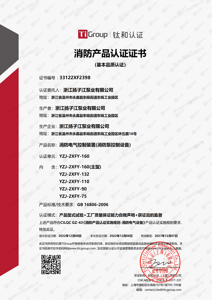 日前,浙江揚子江泵業(yè)順利通過消防泵柴油機消防泵穩(wěn)壓成套及控制柜消防電氣控制裝置消防產品認證.