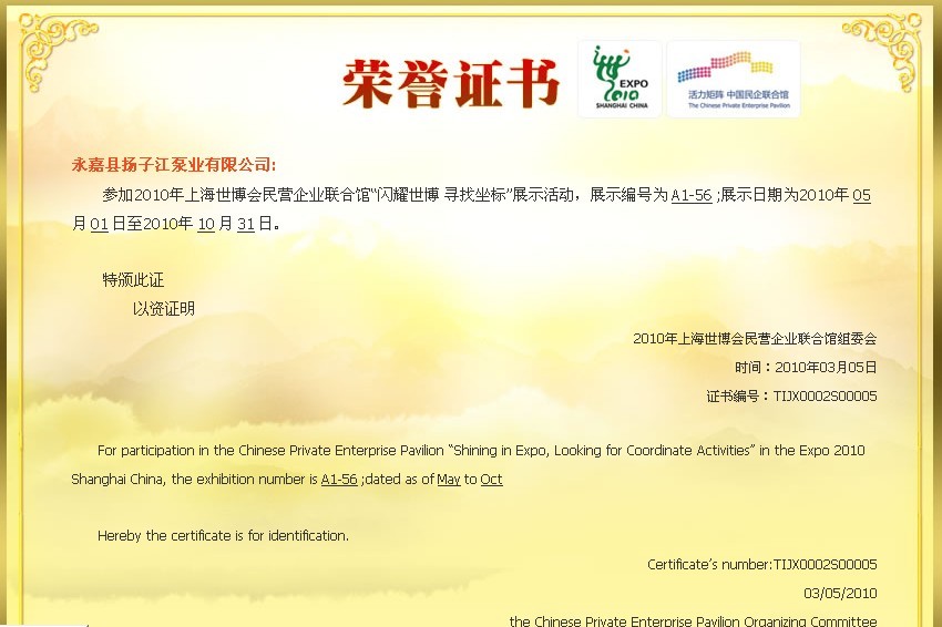 揚(yáng)子江上海世博會(huì)參展證書(shū):