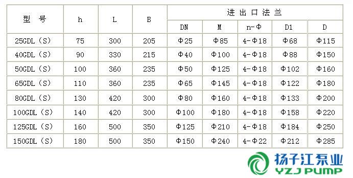 GDL型立式多級管道離心泵安裝尺寸表: