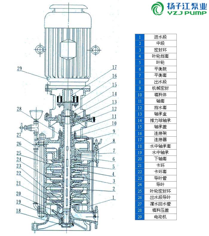 DL型泵由電機(jī)和泵兩部分組成,電機(jī)為丫型三相導(dǎo)步電機(jī),泵和電機(jī)采用聯(lián)軸器連接.整體為剛性連接,使用吋無需校正泵由定子部分利轉(zhuǎn)子部分組成泵定子部分由進(jìn)水段.中段.導(dǎo)葉.出水段、填料函體等零件組成為防止定子磨損,定子上裝有密封環(huán).平衡等,磨損后可用備件更換轉(zhuǎn)子部分由軸.中輪,平衡鼓等組成轉(zhuǎn)子下端為水潤滑軸承.上部為角接觸球軸承.泵的軸向力絕大部分由平衡鼓來承擔(dān),其余小部分殘余軸向力由角接觸球軸承來承受逬水段、中段和出水跺的結(jié)臺面用紙墊通過拉緊達(dá)到密封.軸封采用填料或機(jī)械密封.用戶可根據(jù)需要選擇。