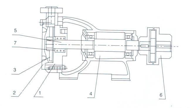 W型分聯(lián)式旋渦泵的主要零件(見結(jié)構(gòu)圖)有(1)泵(2)泵蓋(3)葉輪(4)托架結(jié)合體(5)泵軸(6)爪型彈性聯(lián)軸器(7)特別組合體機(jī)械密封。該型泵與電機(jī)合裝在同一底座上.進(jìn)、出口方向?yàn)樾辫上.經(jīng)接彎管可変為垂直向上。葉輪在軸上能夠自由地作軸向移動(dòng),泵在工作中葉輪能自行調(diào)節(jié)好與泵體和泵蓋之間的間隙。