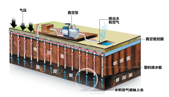 在一片泥漿里,記者看到一塊像水稻田一般的泥地,上面已經(jīng)被鋪上了一層密封膜,密封膜由真空膜、無紡布、濾管網(wǎng)、編織布組成,排水板被密密麻麻插進泥里,一直深入原泥層,邊上是一臺真空泵,將軟泥里的空氣和水通過排水管排出地面,再利用大氣壓強把泥面壓結實!斑@是10畝試驗區(qū),試驗成功后,再到A1區(qū)3800畝試驗,一塊一塊壓!睆埿蹓颜f,這個過程很慢,要慢慢壓,把里面的水和空氣都排出來,需要90天左右,因為泥面會慢慢下沉,因此一般軟基處理前,泥面會高出地面1.2米左右。密封很重要,因此看起來不起眼的膜都是特制的,要特別堅韌、防老化,而且一塊就有1.5萬平方米。