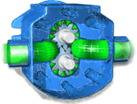齒輪泵的結(jié)構(gòu)如圖所示。泵殼內(nèi)有兩個(gè)齒輪,一個(gè)用電動(dòng)機(jī)帶動(dòng)旋轉(zhuǎn),另一個(gè)被嚙合著向相反方向旋轉(zhuǎn)。吸入腔內(nèi)兩輪的嚙相互撥開,于是形成低壓而吸入液體;被吸入的液體被齒嵌住,隨齒輪轉(zhuǎn)動(dòng)而到達(dá)排出腔。排出腔內(nèi)兩齒相互合攏,于是形成高壓而排出液體。 齒輪泵的壓頭較高而流量較小,可用于輸送粘稠液體以至膏狀物料,(如輸送油品),但不能用于輸送含有固體顆粒的懸浮液。