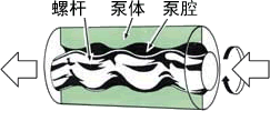(4)螺桿泵(Screw Pump) 螺桿泵內(nèi)有一個(gè)或一個(gè)以上的螺桿。在單螺桿泵中,螺桿在有內(nèi)螺旋的殼內(nèi)運(yùn)動(dòng),使液體沿軸向推進(jìn),擠壓到排出口。 在雙螺桿泵中,一個(gè)螺桿轉(zhuǎn)動(dòng)時(shí)帶動(dòng)另一個(gè)螺桿,螺紋互相嚙合,液體被攔截在嚙合室內(nèi)沿桿軸前進(jìn),從螺桿兩端被擠向中央排出。此外還有多螺桿泵,轉(zhuǎn)速高,螺桿長,因而可以達(dá)到很高的排出壓力。三螺桿泵排出壓力可達(dá)10MPa以上。 螺桿泵效率高,噪音小,適用于在高壓下輸送粘稠性液體,并可以輸送帶顆粒的懸浮液。