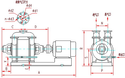 SK型水環(huán)式真空泵的結(jié)構(gòu)如圖2、圖3、圖4所示。