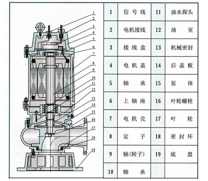 QW型無堵塞潛水排污泵由電機(jī)與泵兩部分組成,二者通過油隔離室及機(jī)械密封組件隔開,屬機(jī)電一體化產(chǎn)品,電機(jī)與泵合用同一軸(轉(zhuǎn)子)整個(gè)水泵長度短,結(jié)構(gòu)緊湊。配備多種保護(hù)裝置,使得泵運(yùn)行可靠,其主部件作用如下: