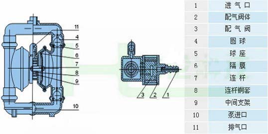 在泵的兩個(gè)對(duì)稱工作腔中,各裝有一塊有彈性的隔膜,聯(lián)桿將兩塊隔膜結(jié)成一體,壓縮空氣從泵的進(jìn)氣頭進(jìn)入配氣閥 后,推動(dòng)兩個(gè)工作腔內(nèi)的隔膜,驅(qū)使聯(lián)桿聯(lián)接的兩塊隔膜同步運(yùn)動(dòng)。與此同時(shí),另一工作腔中的氣體則從隔膜的背后排出泵外。一旦到達(dá)行程終點(diǎn)。配氣機(jī)構(gòu)則自動(dòng)地將壓縮空氣引入另一個(gè)工作腔,推動(dòng)隔膜朝相反方向運(yùn)動(dòng),這樣就形成了兩個(gè)隔膜的同步往復(fù)運(yùn)動(dòng)。每個(gè)工作腔中設(shè)置有兩個(gè)單向球閥,隔膜的往復(fù)運(yùn)動(dòng),造成工作腔內(nèi)容積的改變,迫使兩個(gè)單向球閥交替地開啟和關(guān)閉,從而將液體連續(xù)地吸入和排出。![]() |