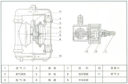 在泵的兩個(gè)對(duì)稱各種腔中,各裝有一塊有彈性的隔膜6,聯(lián)桿7將兩塊隔膜結(jié)成一體,壓縮空氣從泵的進(jìn)氣接頭1進(jìn)入配氣閥3后,推動(dòng)兩個(gè)工作腔內(nèi)的隔膜,驅(qū)使聯(lián)桿聯(lián)接的兩塊隔膜同步運(yùn)動(dòng)。與此同時(shí),另一工作腔中的氣體則從其隔膜的背后排出泵外;一旦到達(dá)行程終點(diǎn),配氣機(jī)構(gòu)則自動(dòng)地將壓縮空氣引入另一工作腔,推動(dòng)隔膜朝相反方向運(yùn)動(dòng),這樣就形成了兩個(gè)隔膜的同步往復(fù)運(yùn)動(dòng)。每個(gè)工作腔中又設(shè)置有兩個(gè)單向球閥4,隔膜的往復(fù)運(yùn)動(dòng),造成工作腔內(nèi)容積的改變,迫使兩個(gè)單向球閥交替地開(kāi)啟和關(guān)閉,從而將液體連續(xù)地吸入和排出。