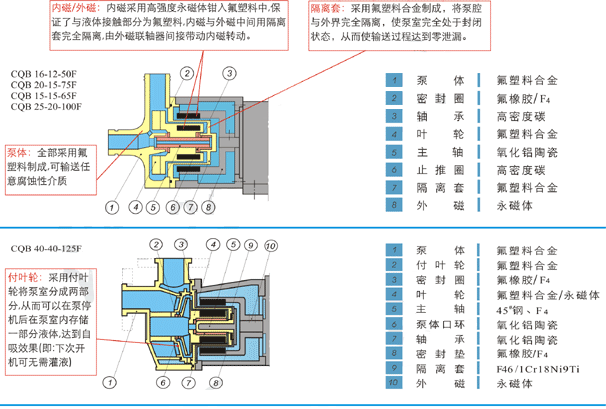 CQB-F型氟塑料磁力泵的設(shè)計不僅具有普通磁力泵的結(jié)構(gòu)緊湊,外型美觀,體積小,躁聲低,運行可靠等優(yōu)點,且其過流部件全部采用目前世界上耐腐蝕性能優(yōu)秀“塑料王”(氟塑料)制造,隔離套采用特殊材料制造,具有高強度的力學(xué)性能,消除了普通磁力泵存在的磁渦流現(xiàn)象。因此,CQB氟塑料磁力泵可輸送任意濃(強)度的酸、堿、氧化劑等腐蝕性介質(zhì)而毫不受損。