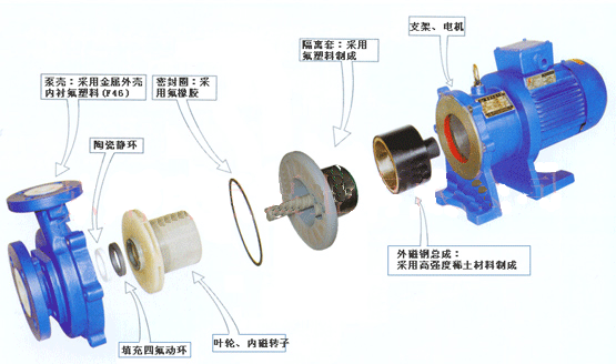 CQB-F型氟塑料磁力泵由泵、磁力傳動器、電動機三部分組成。關(guān)鍵部件磁力傳動器由外磁轉(zhuǎn)子、內(nèi)磁轉(zhuǎn)子及不導(dǎo)磁的隔離套組成。當(dāng)電動機帶動外磁轉(zhuǎn)子旋轉(zhuǎn)時,磁場能穿透空氣隙和非磁性物質(zhì),帶動與葉輪相連的內(nèi)磁轉(zhuǎn)子作同步旋轉(zhuǎn),實現(xiàn)動力的無接觸傳遞,將動密封轉(zhuǎn)化為靜密封。由于泵軸、內(nèi)磁轉(zhuǎn)子被泵體、隔離套完全封閉,從而徹底解決了“跑、冒、滴、漏”問題,消除了煉油化工行業(yè)易燃、易爆、有毒、有害介質(zhì)通過泵密封泄漏的安全隱患,有力地保證了職工的身心健康和安全生產(chǎn)。