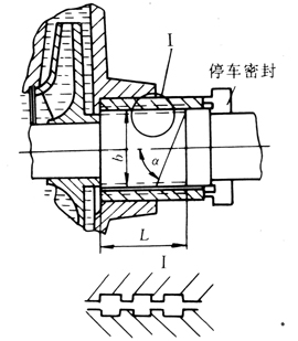 與螺旋密封不同之處是軸套加工成螺紋,且與軸的螺紋旋向相反。當(dāng)軸旋轉(zhuǎn)時(shí),液體在螺旋間增加紊流摩擦,從而提高了密封能力。密封效果比螺旋密封好