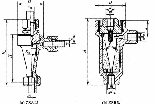 ②旋液分離器  旋液分離器(簡稱旋液器)是利用離心沉降原理來分離固體顆粒(顆粒密度大于化工泵密封流體的密度)的器件,其分離精度可達微米級。我國機械行業(yè)標準JB/T6633-1993《機械密封系統(tǒng)用旋液器》規(guī)定的機械密封系統(tǒng)用旋液器分為ZSA型與ZSB型兩種形式(見圖5-90),其工作參數(shù)為:壓力范圍0.4~6.3MPa;工作溫度為-20~200℃;工作流量2~8 L/min;工作介質(zhì)為含固相顆粒的液體。
