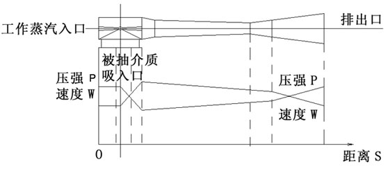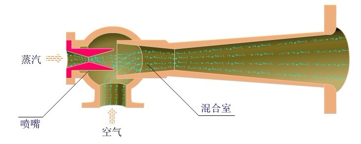 進行能量交換,混合后的氣體進入擴壓器,減速增壓(動通轉(zhuǎn)化為壓強能),為了減少后級泵的抽氣負荷,配置冷凝器,通過有一定溫差的兩種介質(zhì)對流,進行熱交換,達到冷凝高溫介質(zhì)目的,排到大氣壓。(原理見下圖)