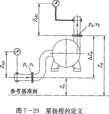 H=(Zd+pd/ρg +vd2/2g)-(Zs+ps/ρg + vsd2/2g)=H2-H1式中  H2,H1—泵出口、進口總水頭。